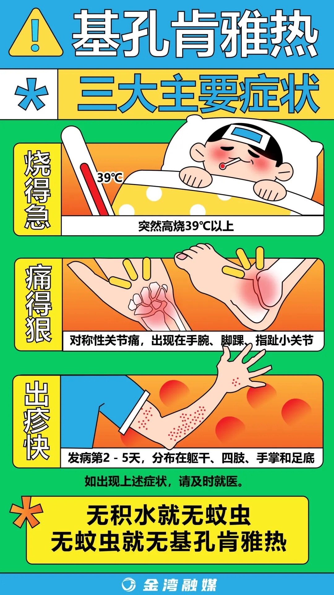 如果您近期有基孔肯雅热流行地区旅行史,或者有明确的蚊虫叮咬史,出现发热、关节疼痛、皮疹等症状,请及时前往医疗机构就诊,并主动向接诊医生说明。