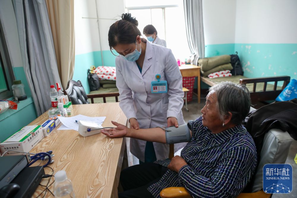 ↑ 8月9日,在榆中县第三中学安置点医疗点,医护人员为受灾人员量血压。